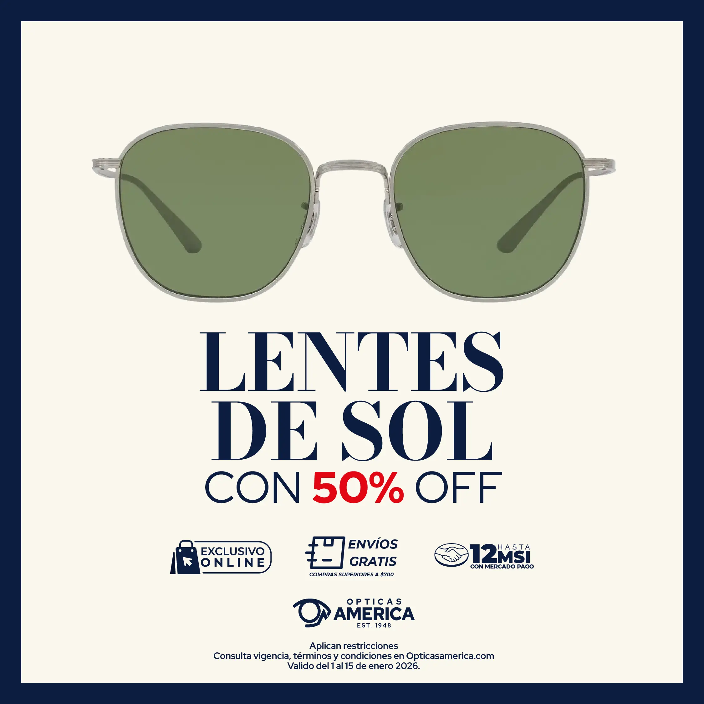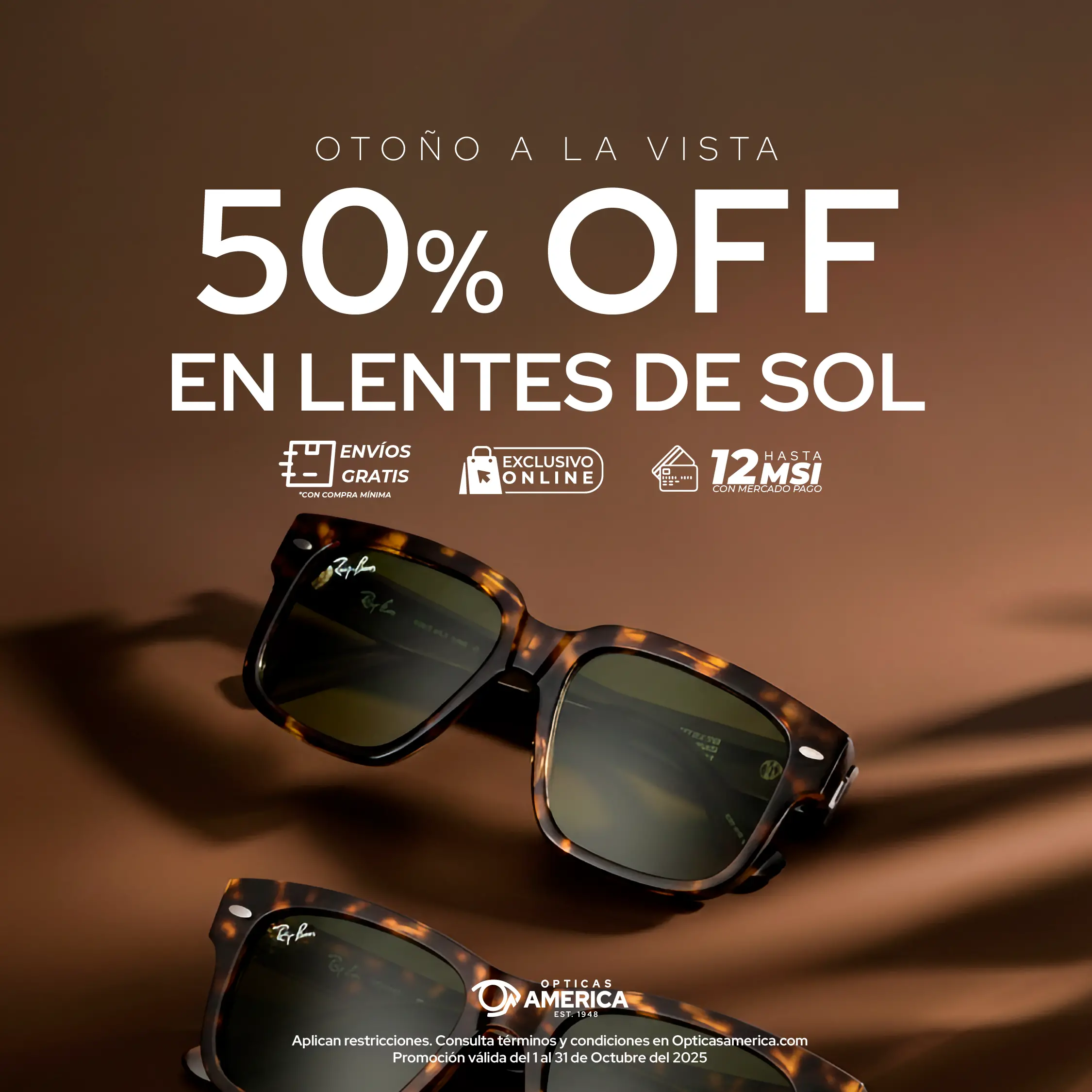 50% descuento en la compra de tu armazón solar. Este descuento aplica directo en tu carrito de compra.